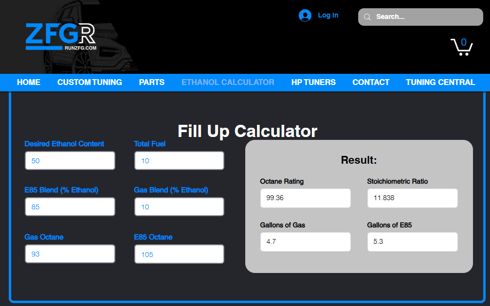 Now that you know what true ethanol content you’re E85 is you are going to go to a ethanol calculator (I will be using ZFG’s) and input the numbers you want.