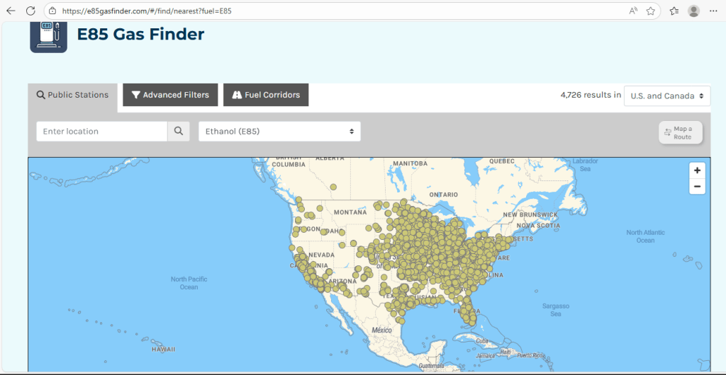 As you can see the biggest concentration of gas stations that offer E85 are in the Central to Eastern United States, as well as the western coast of California. This is because of the close proximity to refineries as well as plentiful corn fields.